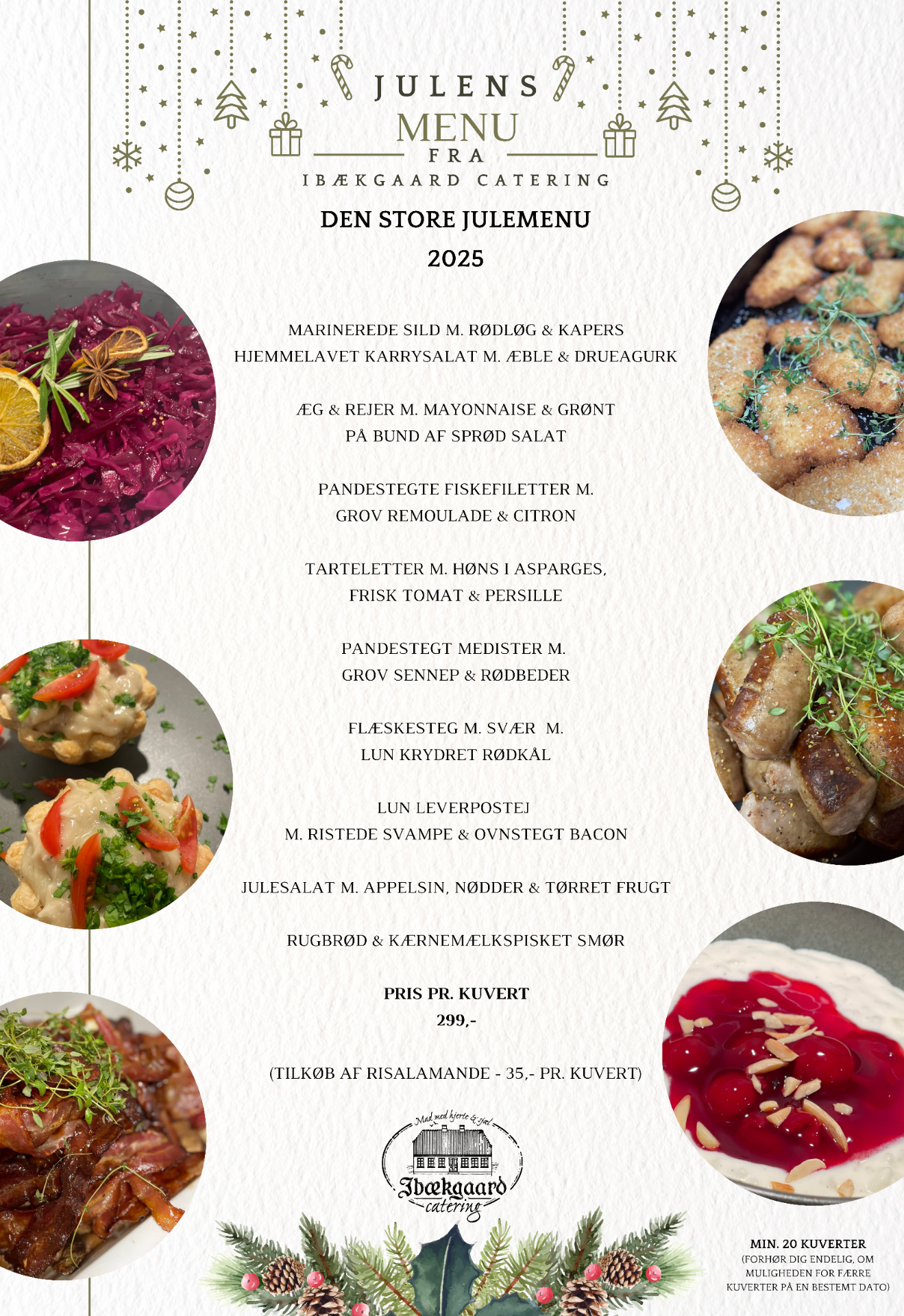 Denne julefrokostmenu, indeholder lidt af det hele - Og vi har også mange muligheder, hvis i ønsker vegetariske alternativer eller en julefrokost, hvor vi skifter de mange elementer med svinekød ud, med fjerkræ eller fisk.